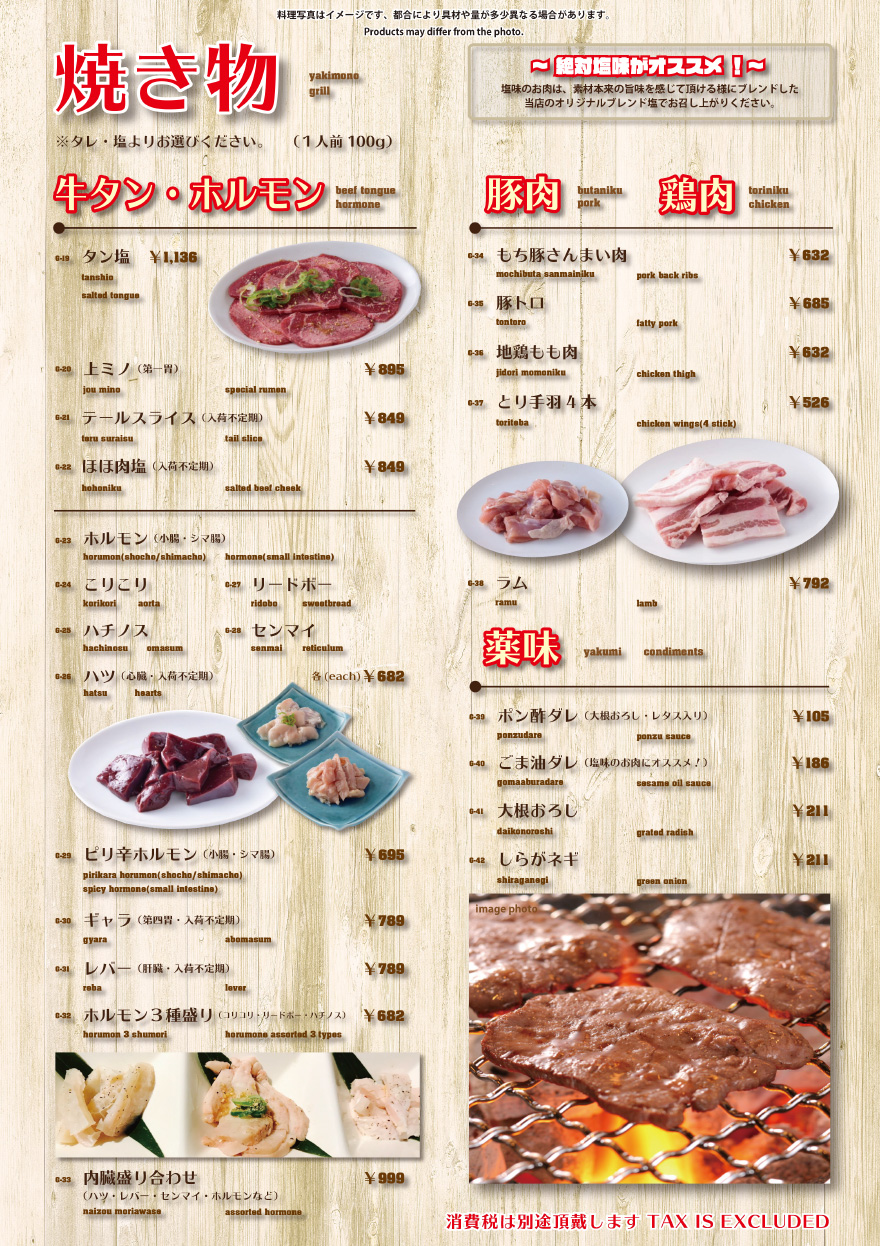 焼き物:牛タン・ホルモン・豚肉・鶏肉